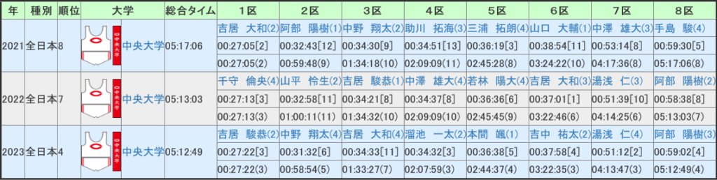 続いては、前回の全日本では最後の最後まで2位を争っての4位、箱根予選では主力を複数欠きながらもルーキーの活躍もあって6位通過を果たした中央大学の全日本大学駅伝における戦力分析と区間配置予想を行っていきます。エントリー一覧、過去5年の成績はこのようになっております。