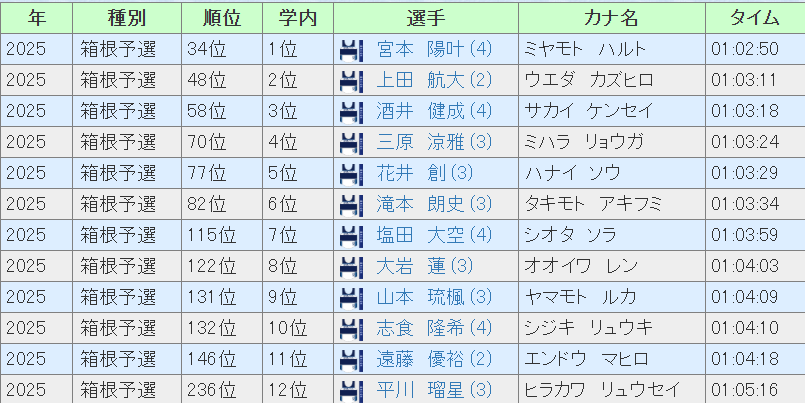 三原が70位、花井が77位、滝本が82位で続いて100位以内は6人ということに。三原、滝本はともに前回の箱根を走っていますし、花井も全日本で良い走りを見せていますからね。実力者がしっかりとチーム上位に入ってきました。塩田が115位、大岩が122位、山本が131位、志食が132位とチーム7~10番手がわずか11秒の間に揃っていたのも良かったですね。塩田は2年連続チーム7番手、大岩は前回2番手、志食は3番手の快走だっただけに、今回は揃ってやや苦しかったですね。山本は予選会初出場ですし、よく走ったと思います。