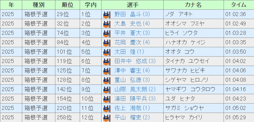 それでも箱根予選メンバーが12人中9人残るのは大きい。3年生は箱根予選でチーム最多となる5人が出場、野田はエースとしてチームを牽引していく存在ですし、平井、田井中ともに箱根予選で存在感を見せました。重山、湯田もハーフで63分台は持っていますし、他にも加藤、星野ら3大駅伝・予選会出場が待たれる選手もいます。この学年が来年度も中心になっていくことでしょうし、チームを牽引していってほしい。