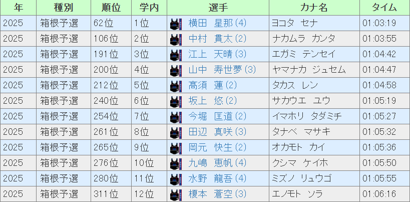 62位だった横田がチームトップ、そして唯一の2桁順位ということに。今年度は全日本予選でも最終組を走り、2年連続で箱根予選で結果を残した唯一の選手となったかな。2番手の106位に中村、3番手の191位に江上で100位台もわずかに2人ですから、あまりにも厳しすぎる…中村はエントリー自体初めてでよく走ってくれました。江上は中村とも47秒離されていますし、もう少し上位で走ってもらいたい選手です。