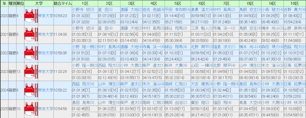 最も良いのは9区の7.0位、続いて8区の7.8位ということでシード争いにおいても大事になってくる2区区間に強いというのが帝京の勝負強さを表しているようにも思えます。その一方で最も苦手としているのは6区の14.0位、次に悪いのが2区の11.2位ですからやや抜けて苦戦している区間となります。6度の箱根で区間15位以下が4回、そう考えると前回区間4位の廣田がいるというのは帝京にとってあまりにも心強いですね。