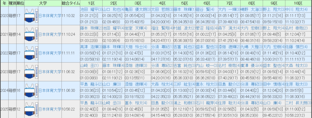 この6年間はシードを獲得出来ておらず、復路でもシード争いに加われたのが前回くらいということもあり、平均順位が1桁の区間はなく、最も良いのが10.8位の1区ということになります。ここでは池田や平島とエース級が区間3位で走っているのが光ります。往路では3区の11.8位が次に良い順位であり、日体大は3区をずっと区間中位でまとめられているのは大きい。その一方で4区は15.8位と10区間中最も悪い区間順位となっており、3区で耐えても4区で崩れてしまうという展開が多いかな。前回、シード争いに加わり続けられたのは4区5位で走った田島の存在が大きかったです。
