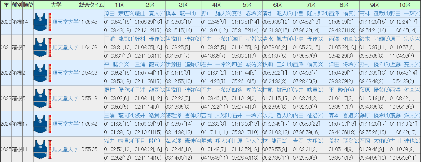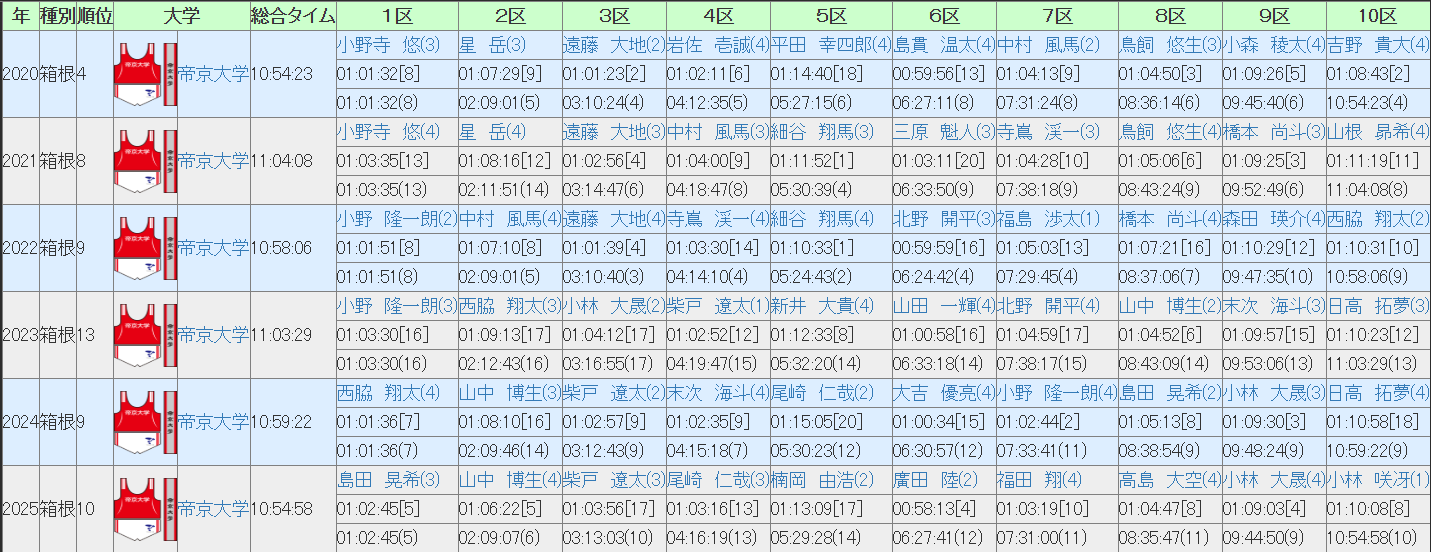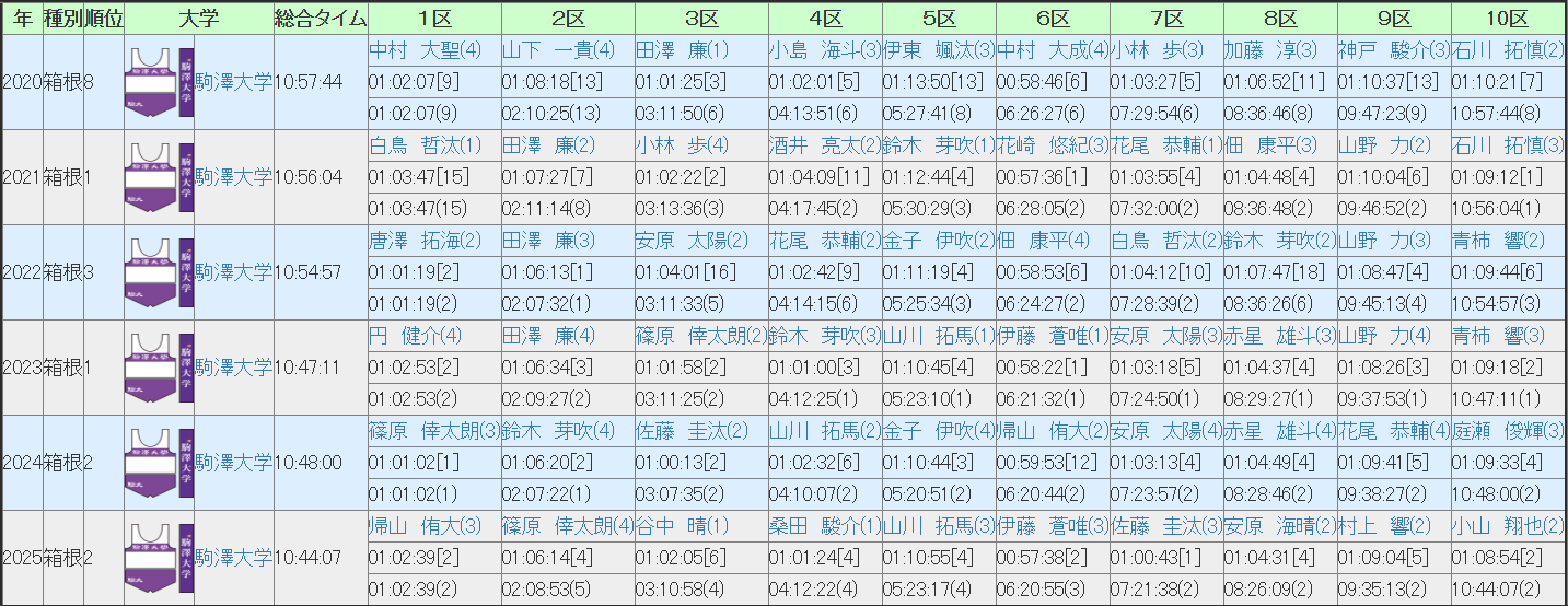 特に往路は5.0~6.3位とわずか1.3位の間に5区間全てが収まっていますからね。ここまで区間順位が近寄っているのは凄まじいです。ただ、安定しているということは逆にいえば爆発力がないとも。圧倒的に稼ぐ区間というのが優勝を果たすには必要になってくることも多いですから。ただ、今回は駒澤も復路にかなり自信があるようですし、そうなると優勝を狙うには往路で他の優勝候補に対して稼ぐ区間をどれだけ作れるかかなあ。