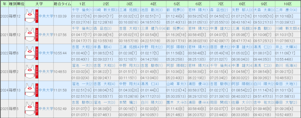 最も良い順位は5.5位の6区、この6年間は若林、浦田の2人だけが担っている区間ですし、下りのスペシャリストをしっかりと育ててくる中央の強さは昔から今にいたるまで健在です。次いで6.8位の4区ということに。個人的にはやや意外だったのですが、振り返ってみると他の往路は区間賞を含めインパクトのある走りを残している一方で、崩れるときもありましたからね。4区はこの5年間もずっと区間1桁ですし、高いレベルで安定しています。続いて10区の7.3位となっており、チーム10番手が走ることも多いこの区間での強さは中央の選手層も示しているかな。