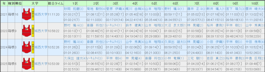 城西は2020、2022の箱根でいずれも出場出来ていないため、6年で4度の箱根出場となっています。その中で何と言っても目を引くのは5区の2.8位という驚異的な順位です。城西躍進の象徴でもあった山本唯が2度の区間賞、そしてエースの斎藤が万全で無いながらも区間3位、5区の強さは圧倒的で今回も斎藤が担うとなれば非常に楽しみです。往路で次いで良いのが7.5位の1区ということに。過去4大会はいずれも出遅れることなく繋げているのも城西の安定感に繋がっていますし、今回も1区は非常に大事になってきそう。