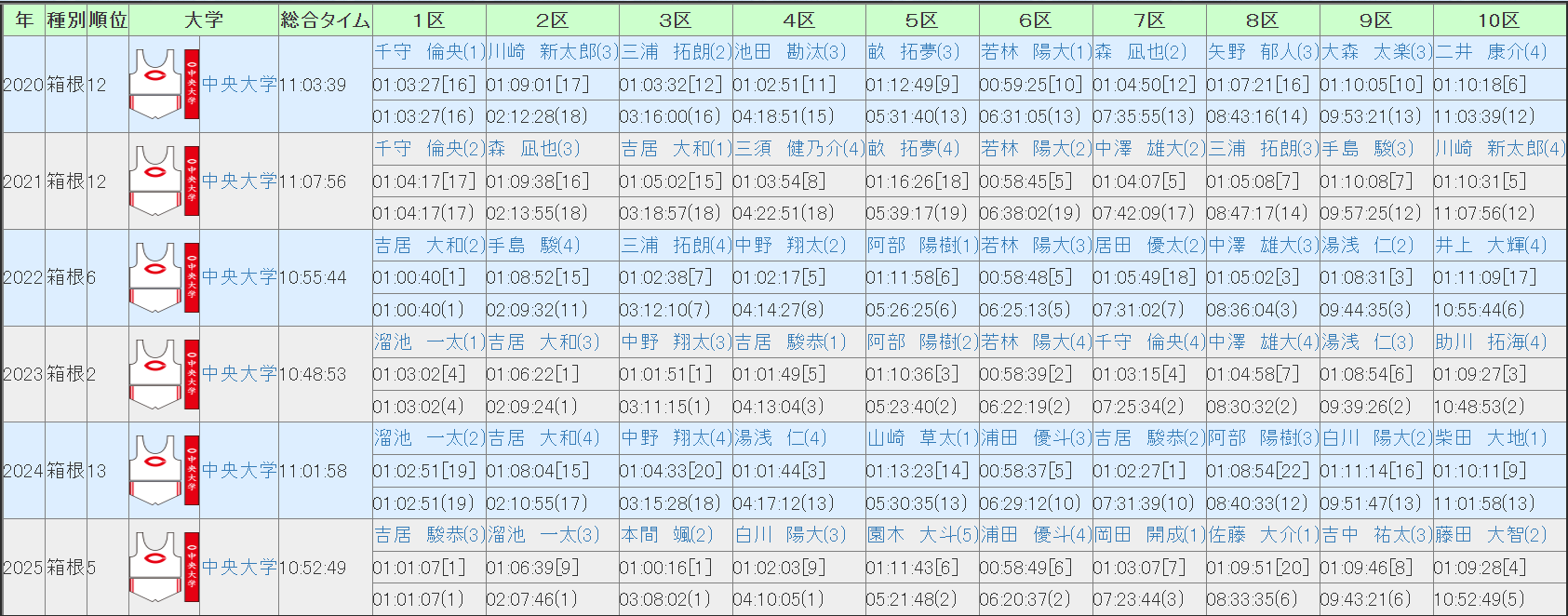 最も良い順位は5.5位の6区、この6年間は若林、浦田の2人だけが担っている区間ですし、下りのスペシャリストをしっかりと育ててくる中央の強さは昔から今にいたるまで健在です。次いで6.8位の4区ということに。個人的にはやや意外だったのですが、振り返ってみると他の往路は区間賞を含めインパクトのある走りを残している一方で、崩れるときもありましたからね。4区はこの5年間もずっと区間1桁ですし、高いレベルで安定しています。続いて10区の7.3位となっており、チーム10番手が走ることも多いこの区間での強さは中央の選手層も示しているかな。