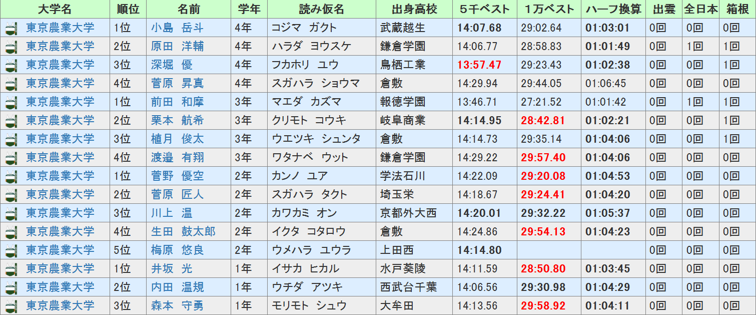本日より各大学ごとに区間配置予想及び戦力分析をしていきます。順番はいつも通りランダム、最初は東京農業大学になります。前年度はわずか1秒届かずに予選落ちとなってしまいましたが、今年度の箱根予選では6位と危なげなく通過、チーム5番手でも41位とエースに頼るチームではなくなってきたかな。エントリーメンバー、箱根成績(直近5年)はこのようになっています。