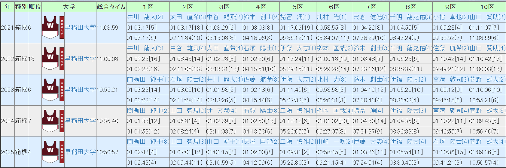 本日は早稲田大学について、区間配置予想及び戦力分析をしていきます。前回の箱根は特に5,6区という山での快走や大事な区間をしっかりと抑え、3位まで10秒差の4位と2018年の箱根で3位に入って以来となる3大駅伝での4位でした。今年度の出雲では最終区まで優勝争いに加わる走りで2位、こちらは2016年の全日本で2位になって以来の好順位でした。全日本は主力を複数欠いたことが響いたものの、それでも新戦力の台頭に工藤の8区日本人最高タイムの走りもあって5位は確保しました。エントリーメンバー箱根成績(直近5年)はこのようになっています。