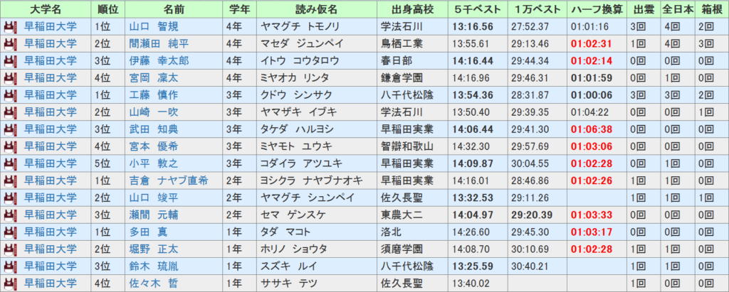 その一方で主力の中で唯一外れてしまったのが、前回4区8位で走っている長屋、今年度は全然姿を見せていませんでしたし、仕方のないエントリー漏れですが、往路を1桁で走った選手がいないのはやはり痛いです。全日本にエントリーされた16人中15人が一緒で1年の山田が唯一外れた一方で武田が3大駅伝初エントリーとなっています。現状のベストなエントリーと言って良いでしょう。そんな早稲田大学の区間配置予想は以下の通りです。