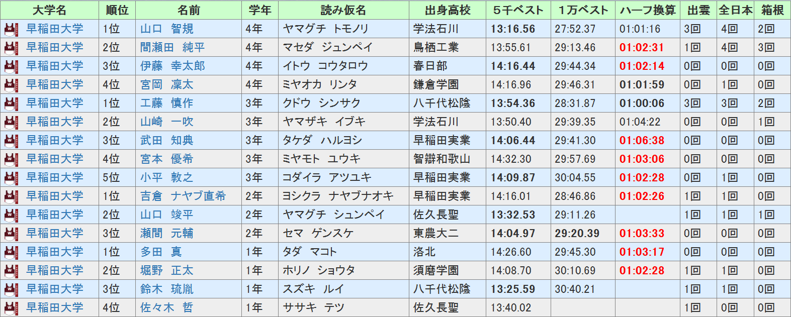 駅伝は先頭を走るチームが有利となりますし、早稲田が最後まで先頭をキープしても驚きはありません。もちろん、気になるところもあります。早稲田としては選手層は厚くなってきたと思いますが、それでも他大の優勝候補と言われる大学と比べれば薄いのは事実、往路だけではなく7区以降も耐えるだけではなく稼ぐ区間を作れるかは大事になってきます。また、箱根の経験という点では、前回7~10区を走ったのが4年生ということもあり、長屋のエントリー漏れもあって箱根経験者は5人しかいません。