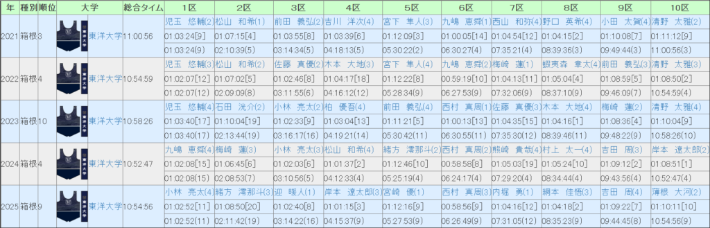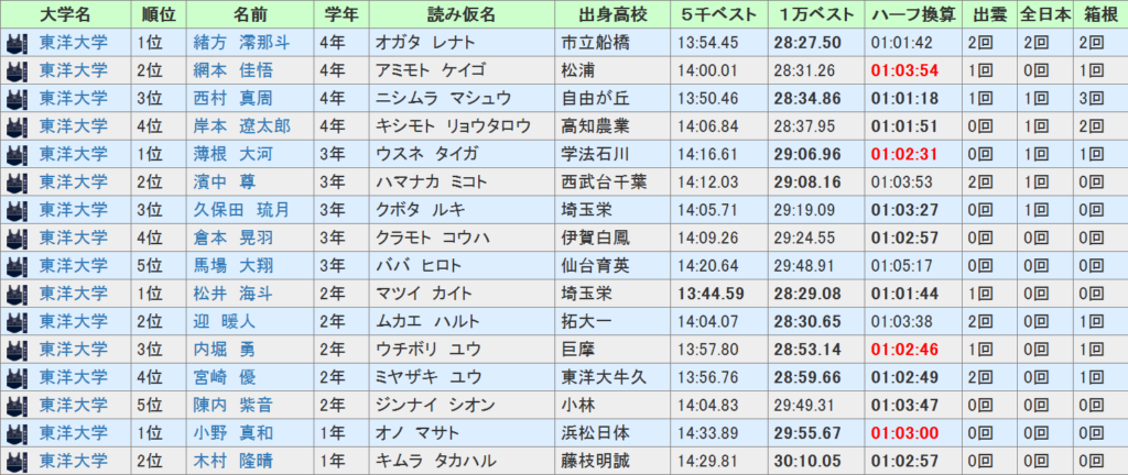 本日は東洋大学について、区間配置予想及び戦力分析をしていきます。前回の箱根は主力を故障で複数欠く苦しいチーム状況、さらに2区終了時で総合19位だった時はさすがにシードは厳しいかと思いましたが…3区以降は見事に巻き返し、10区で4校によるシード争いを制して総合9位、シードを死守しました。今年度の出雲では1区から出遅れてしまうと、そこから巻き返せずに総合9位、全日本出場を逃したことでそのまま箱根に臨むことに。それでも出雲以降、1万やハーフでしっかりとタイムを伸ばしています。エントリーメンバー、箱根成績(直近5年)はこのようになっています。