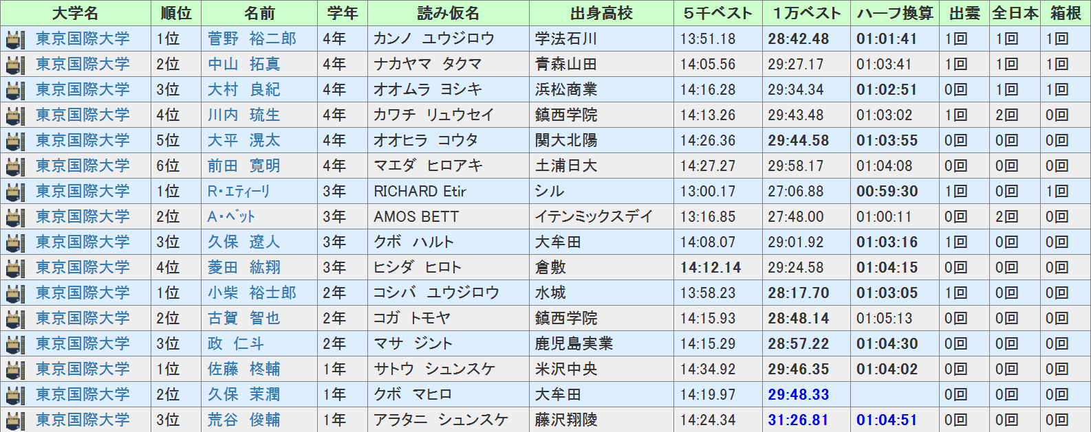 箱根シード校の中では前回からの戦力ダウンが大きく、全日本に出場出来なかったこともあって、おそらく最も前評判の低いシード校だと思います。予選会校で最もシード獲得を期待されるのが順大ならば、予選会校が最もシード枠を狙っているのが東国大なのでは無いかと…しかし、東京国際は箱根予選よりも箱根の方が遥かに得意としているんですよね。過去5大会を見ても5→10→5→11→8位と最も悪い順位で11位、前回シードを獲得すると予想した選手は少なかったでしょう。