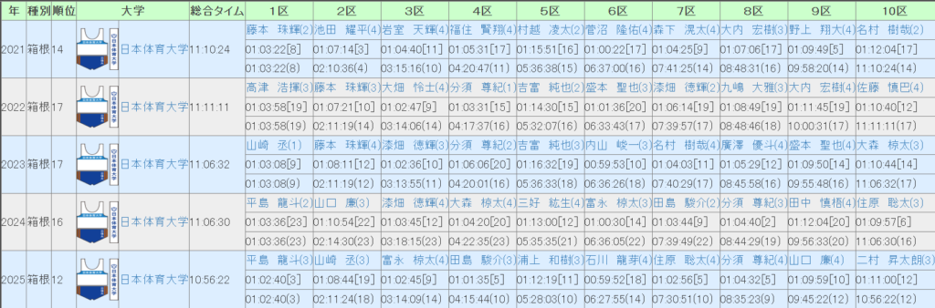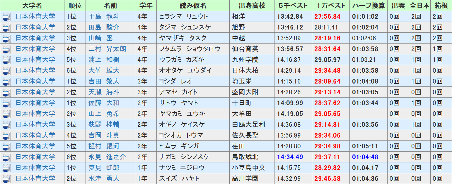 本日は日本体育大学について、区間配置予想及び戦力分析をしていきます。前回の箱根は往路を10位とシード圏内で久しぶりに終え、8区終了時でも9位とシード圏内につけましたが、ハイレベルすぎた9区以降のシード争いにはついていけずに12位でシード獲得とはなりませんでした。今年度の箱根予選は稼ぐべき選手は稼いだものの、100位以内はわずか4人とチームとしては苦戦、これまで箱根予選は6位以内で通過していましたが今回は9位と最も苦戦することとなりました。しかし、全日本では7区終了時で8位と終始シード争いに加わっての11位と十分に見せ場を作ってくれました。エントリーメンバー箱根成績(直近5年)はこのようになっています。