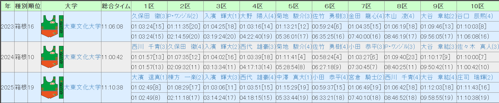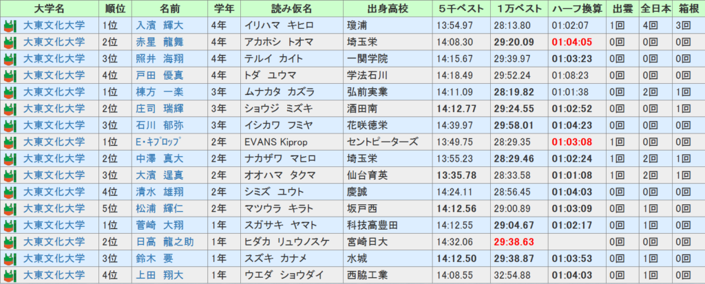最後は大東文化大学について、区間配置予想及び戦力分析をしていきます。前回の箱根は1区こそ8位でしたが2区以降は苦戦が続いて往路は19位、復路でも順位は上げられずに総合19位で2年連続のシード獲得とはなりませんでした。今年度の箱根予選でも8位と下位通過、全日本では1区で出遅れてしまうと、一桁順位は1区間のみと苦戦、13位と駅伝シーズンでは苦戦が続いています。エントリーメンバー、箱根成績(直近5年)はこのようになっています。