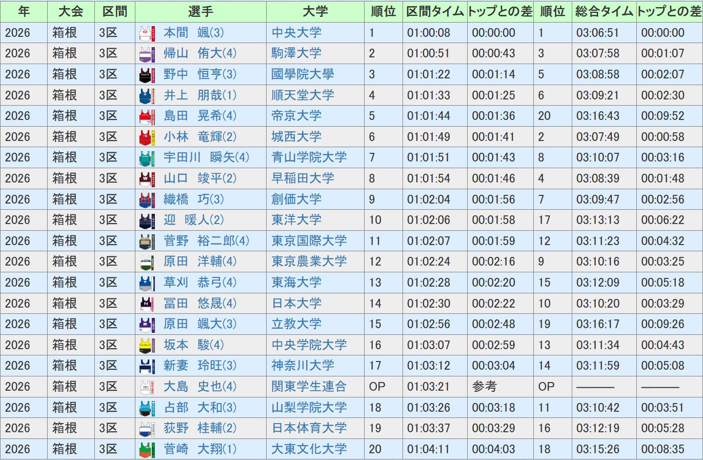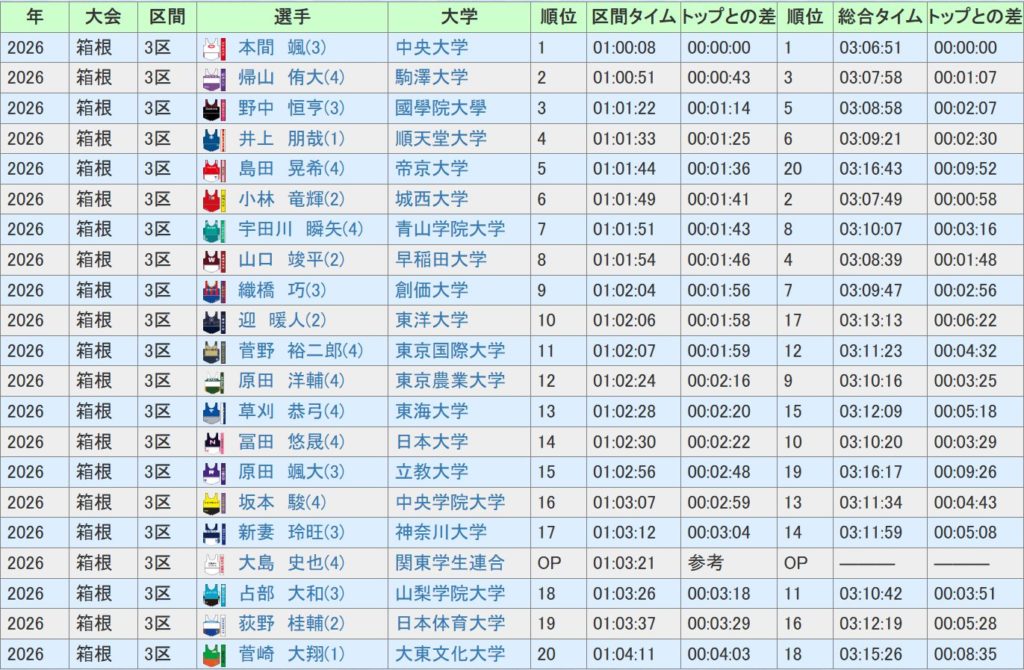 第102回(2026年)箱根駅伝 3区振り返り ~区間賞:本間(中央)~
